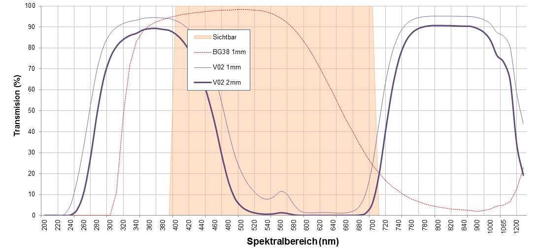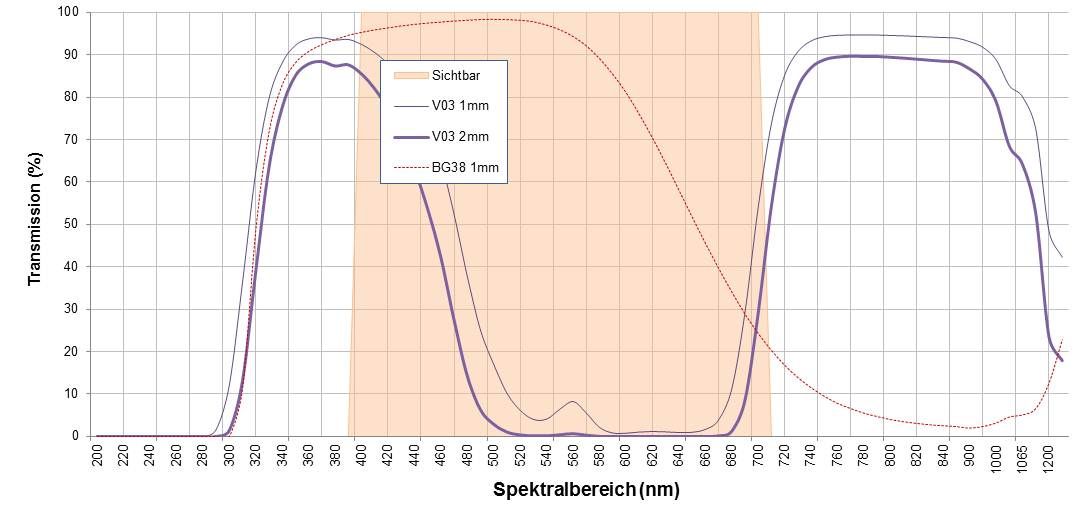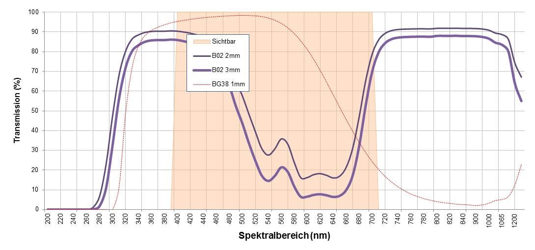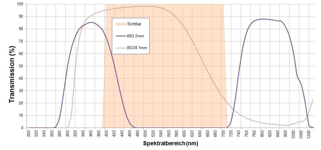 In folgenden Abbildungen wird der interne Sperrfilter mit einem Schott BG38 in 1 mm Stärke zur groben Orientierung an IR-taugliche Kameraverhältnisse simuliert und durch den gestrichelten Kurvenverlauf dargestellt.
